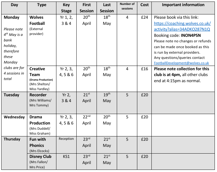 We are pleased to be able to offer a variety of after school extra-curricular clubs here at St. Peter’s. All clubs run for an hour after school (from 3:15 – 4:15pm) unless otherwise stated.